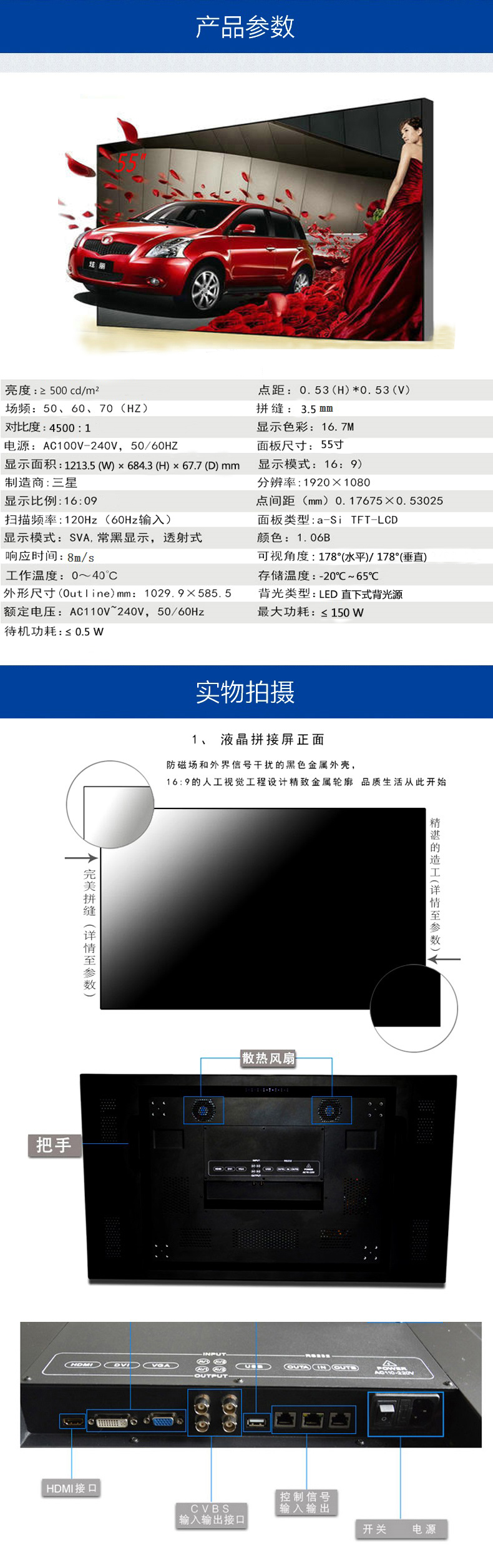 产品介绍: 产品介绍:产品采用三星DID液晶拼接屏,双边拼缝3.5mm,采用高分辨率、高亮度、高对比度、宽视角的高清LCD显示面板,支持1080P全高清数字视频显示。 质量管理体系上严格按照ISO90